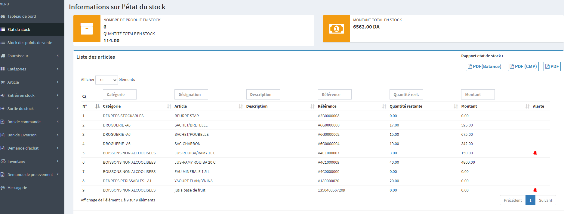 L'état stock vous offre une vue globale sur les quantités d'articles en stock, avec une alerte pour les articles avec quantité minimale (avertissement de rupture), ainsi que d'autres informations comme le total d'articles, de quantités et le montant global du stock.